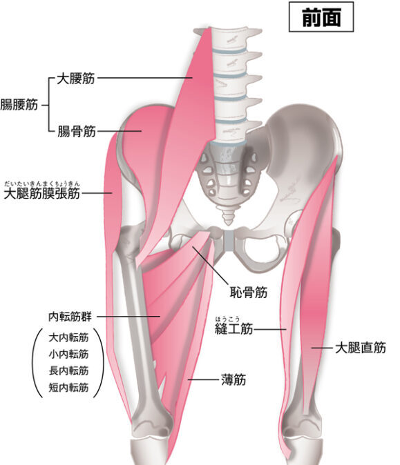 例えば、座っている時間が長い方だと、腰の深層にある筋肉(腸腰筋)や股関節の前面にある筋肉(縫工筋・大腿直筋)が硬くなりやすいので