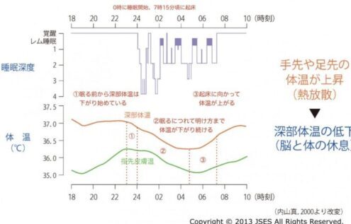 熱が放散せれる事で深部体温が徐々に低下していき体が眠る準備をし始めます。これは代謝を下げて脳や内臓などを休めるための反応と考えられます。