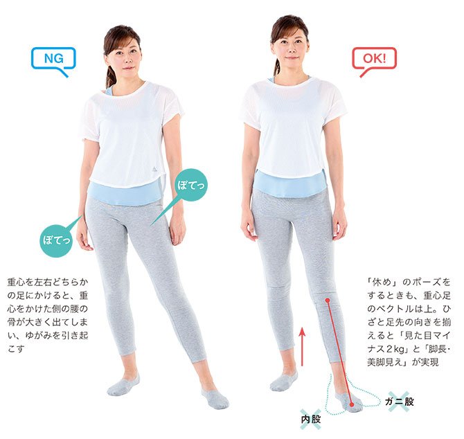 画像の[NG]ような姿勢で立ってしまうと体重を載せている側の脚に負荷がかかるので、
