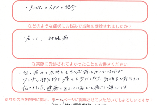 2024年12月 ブログ / 姿勢 / 整体 / 股関節の痛み / 膝の痛み / 身体のこと 長い時間座っていた状態から立ち上がった時に痛くなる膝の痛み その... 2024.12.15 ストレス / ブログ / 肩こり / 自律神経 / 身体のこと / 首の痛み 患者さまの声 2024.12.03